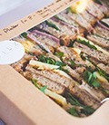 Plateaux de présentation en carton recyclé pour sandwichs. Ouverture par glissement et arrêt pour ouverture sécurisée. Fenêtre transparente en PLA fabriqué à base de plantes – 72% moins de carbone que le plastique. Possibilité de compartiments pour séparer en 1/4 ou1/2 - idéal pour réceptions et services traiteur.