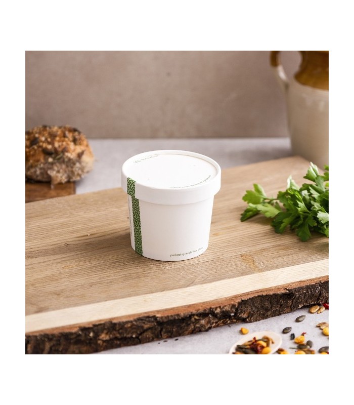 Optez pour une solution responsable avec ce couvercle à soupe haute qualité : conçu à partir de papier issu de sources durables et doté d'une doublure en PLA végétal, il offre une étanchéité parfaite et une excellente résistance à la chaleur. Ce couvercle polyvalent est conçu pour s'adapter précisément à nos trois formats de bols (soupe ou glace) : 170 ml, 225 ml et 275 ml, garantissant un transport sécurisé pour toutes vos préparations chaudes ou froides.
