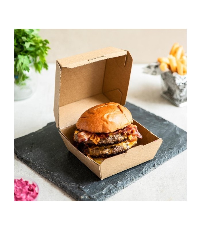 Garantissez une dégustation parfaite à vos clients avec notre boîte à burger de première qualité, spécifiquement étudiée pour une conservation optimale de la chaleur. Grâce à sa structure en carton ondulé, ce contenant offre une isolation thermique supérieure tout en étant léger et extrêmement robuste. Sa conception intelligente permet un empilage sécurisé, optimisant ainsi l'espace de stockage et la stabilité lors du transport.