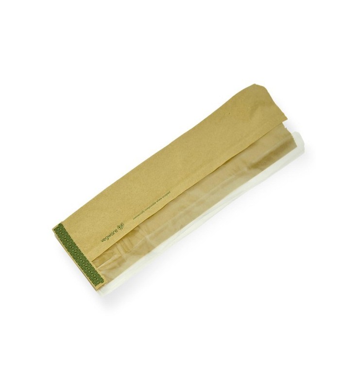 Spécialement conçu pour les baguettes, qu'elles soient servies chaudes ou froides, ce sac allie praticité et esthétique naturelle. Sa fenêtre transparente en NatureFlex — un film innovant fabriqué à partir de pulpe de bois — offre une visibilité parfaite sur vos produits tout en étant remarquablement résistante à la graisse.