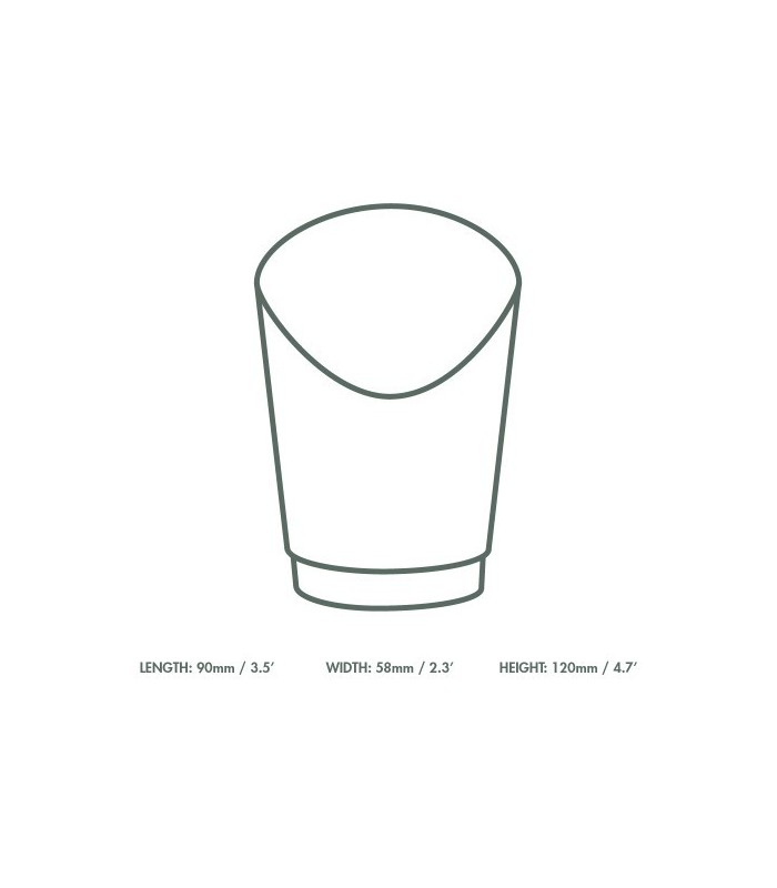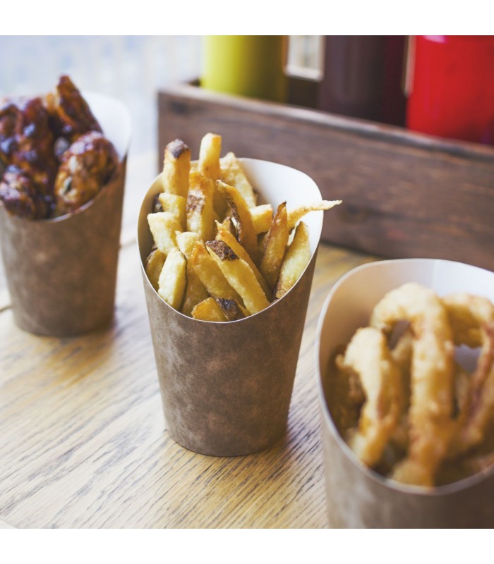 Qu'il s'agisse de frites croustillantes, de wraps généreux ou de fruits à coque grillés, ce contenant offre une présentation élégante et pratique tout en assurant un contrôle parfait des portions. Sa base plate garantit une stabilité optimale sur table ou en plateau.