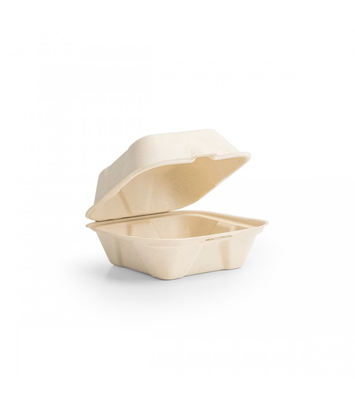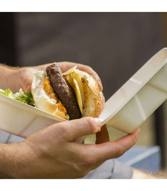 Offrez à vos créations le packaging qu'elles méritent avec notre boîte à hamburgers en fibre moulée, alliant praticité et élégance naturelle. Sa structure innovante en fibres végétales possède une propriété unique : elle ne retient pas la condensation. Résultat, votre pain reste parfaitement croustillant et ne se détrempe jamais pendant le transport. Cette boîte présente un couvercle et une base de profondeur identique, se transformant en deux plateaux distincts une fois ouverte — idéal pour un partage convivial.