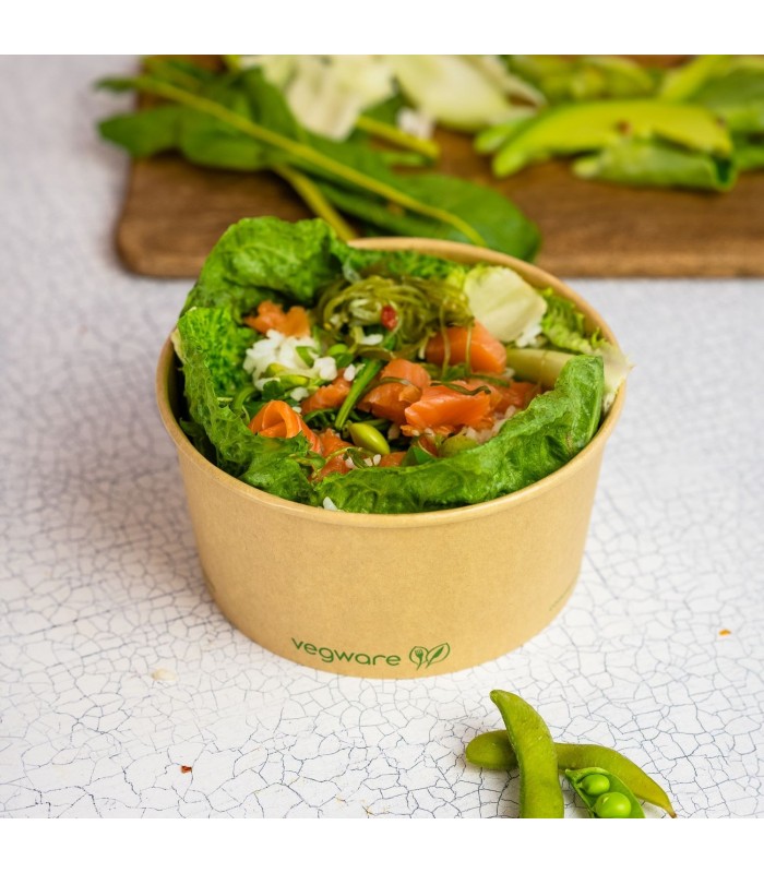 Conçu spécifiquement pour la vente à emporter, ce bol large allie robustesse et éthique. Sa grande innovation réside dans sa doublure à base d'eau, une technologie de pointe qui assure une étanchéité parfaite sans utiliser de films plastiques traditionnels. Compatible avec les couvercles de la série 150mm de diamètre, ce bol est certifié pour le compostage industriel et reste parfaitement recyclable, offrant une solution 100 % circulaire.