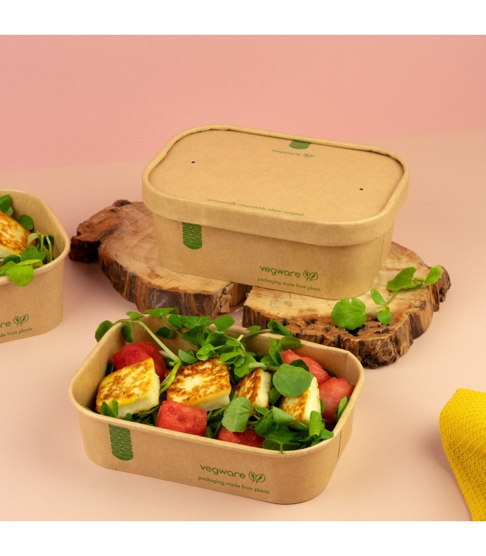 Couvercle en papier kraft pour récipients alimentaires kraft rectangulaires. Gardez vos aliments au chaud en posant ce couvercle. Fabriqué à partir de carton kraft issu de sources durables avec une doublure à base d'eau. Kraft marron avec message vert. Couvercle fabriqué à partir de plantes. Conçu pour le compostage industriel, fabriqué à partir de matériaux recyclables.