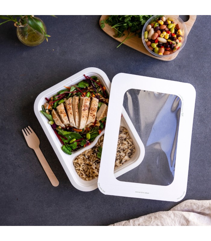 Sublimez vos présentations grâce au couvercle avec fenêtre de la gamme Gourmet, conçu pour offrir une visibilité immédiate et appétissante sur vos créations culinaires. Alliant l'élégance naturelle du carton à une fenêtre transparente en cellulose biosourcée, il permet de valoriser la fraîcheur de vos plats tout en assurant une protection optimale. Ce couvercle haut de gamme garantit une fermeture sécurisée pour le transport et la livraison.